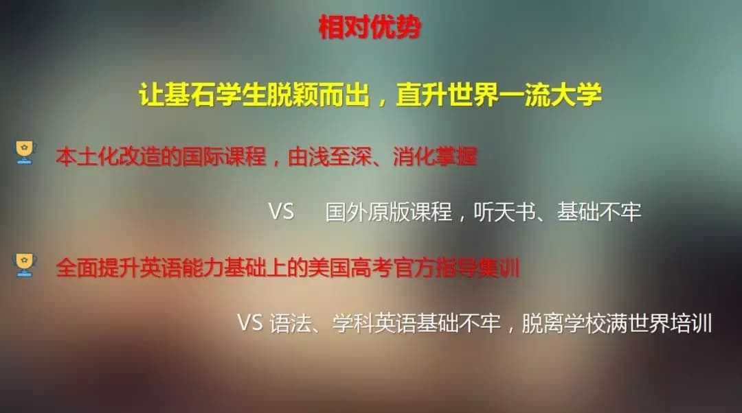讲到符合家长需求的国际高中该有怎样的标准时,他以毕业生为案例,讲了学校的发展史、ACT课程设置、师资的配置、教学成绩、独特优势。同时,庞校长讲到,面对出国后天差地别的境况,他认为社会上的留学生缺少“真正的英语学术能力以及与国外大学的衔接”。某些留学机构利用了家长们对留学专业知识的匮乏并急于求成的心里,给学生规划一轮又一轮的托福、雅思培训,通过短期突击、技巧培训提高分数,而这样的做法相当于空中盖楼。