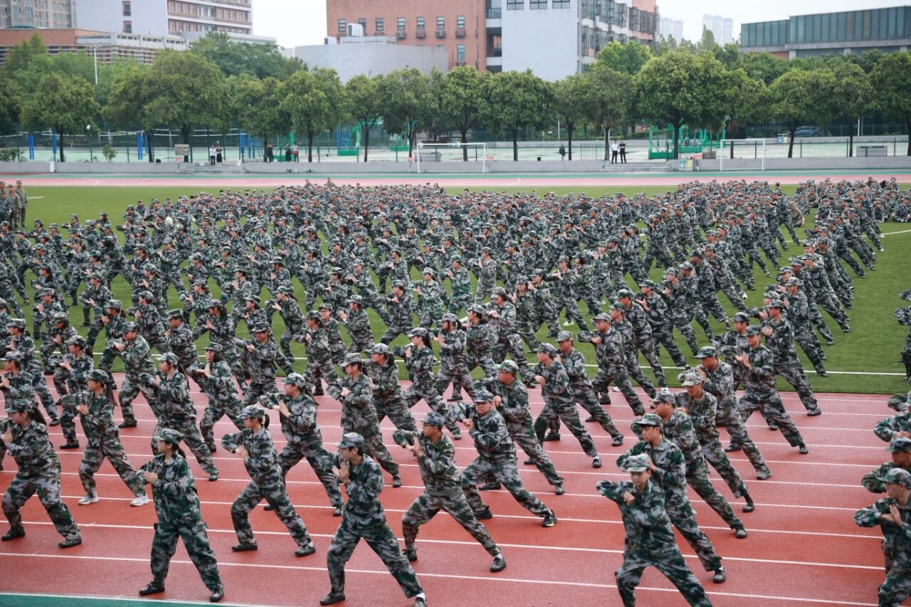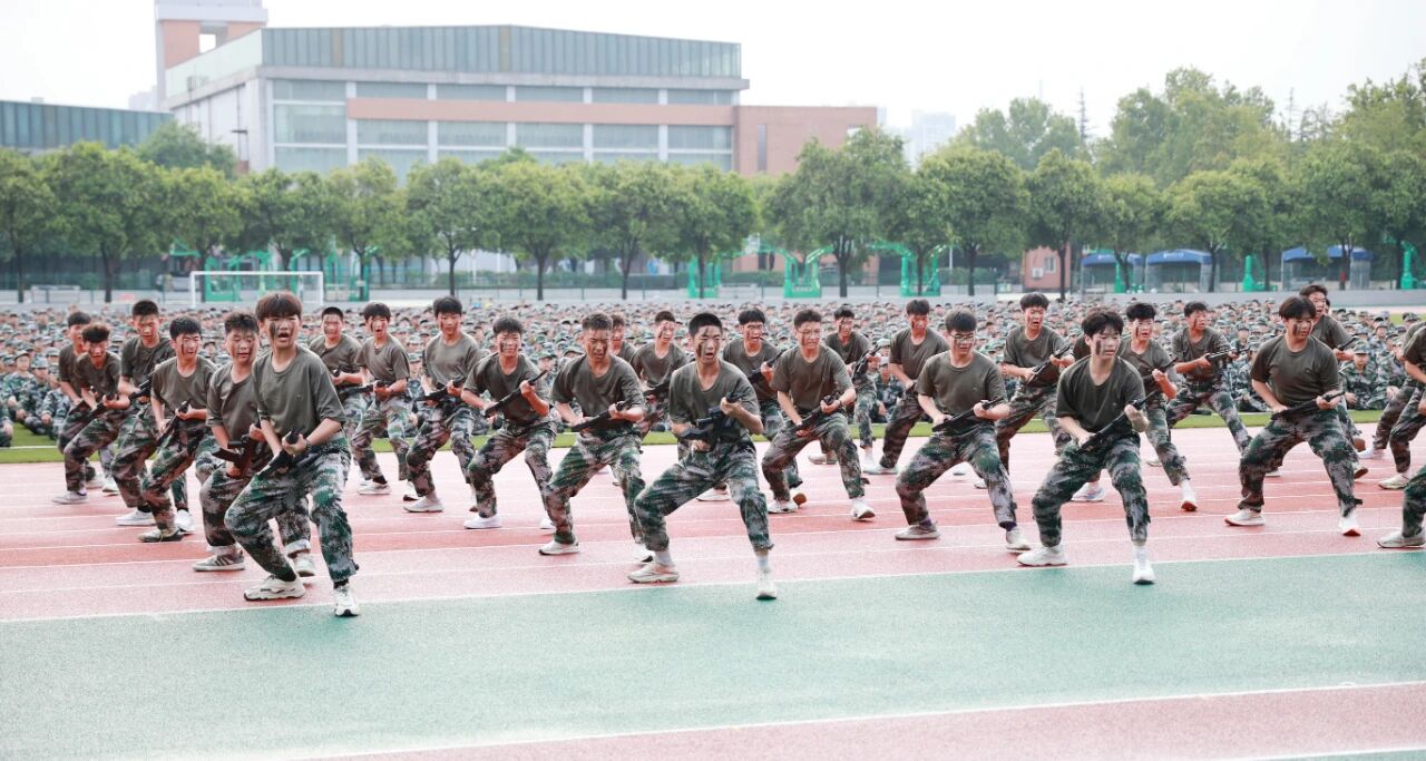 训练成果在此刻集中展示。刺杀操方队成员手持模拟枪械,动作刚劲有力、节奏整齐划一,嘹亮的呐喊声震彻校园,尽显少年热血与无畏气魄。