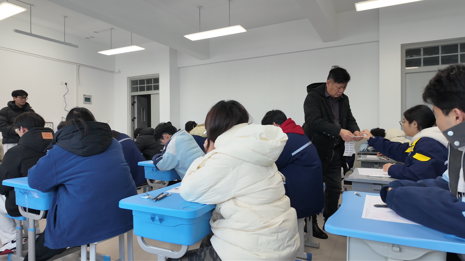 “试水”解题显身手,师生同考促提升。学校对此高度重视,由宫世浩校长担任巡考,教务处老师全程现场监考,从试卷分发到答题规范,再到交卷收存,每一个环节都严谨有序,确保考试公平公正。考场上,教师们化身专注答题的“考生”,时而凝神思索,时而挥笔疾书,眉宇间满是认真与专注,亲身感受着高考备考的节奏与考点脉络。
