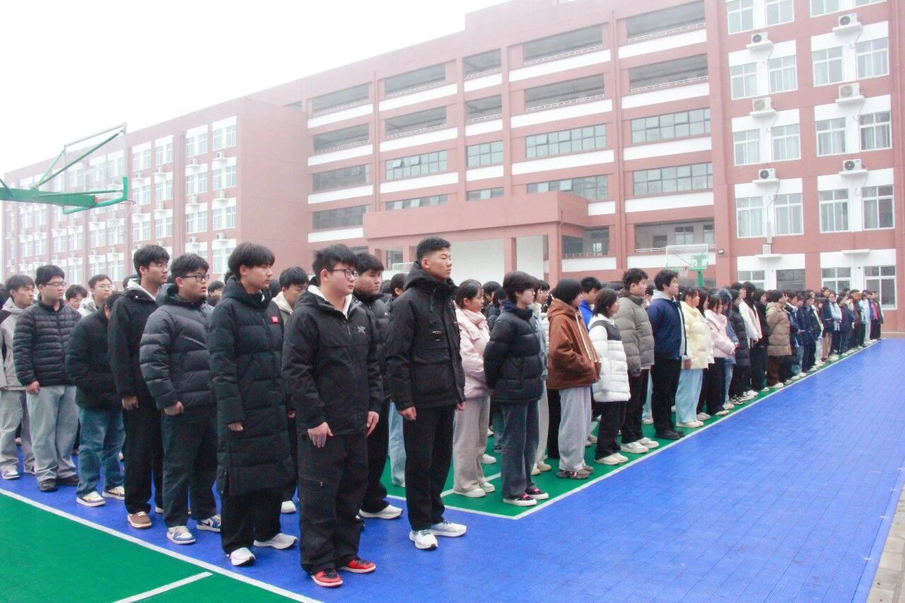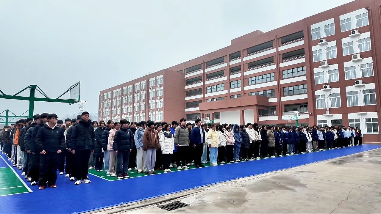 清晨的校园沐浴在初春的柔光中,全体师生精神抖擞,在操场整齐列队。