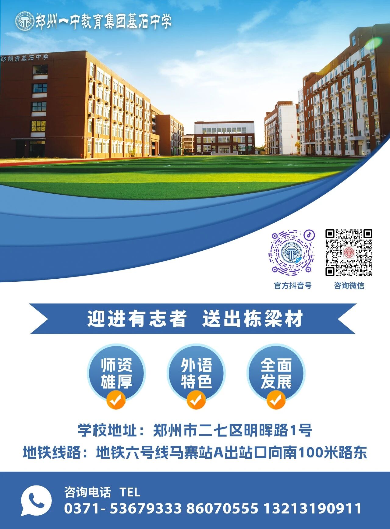 郑州市基石中学是2007年经郑州市教育局批准成立的全日制寄宿制高中,现为郑州一中教育集团成员校。学校深耕教育、立德树人,致力于打造优质、多元、国际化的高中教育体系,为学生成长搭建广阔平台。