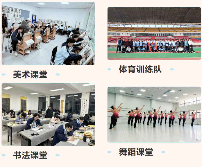 学校以学生需求为导向,开设美术、书法、体育、音乐、舞蹈、播音主持等特长班进行专业培养,采用小班化教学与个体专项辅导,夯实专业基础,同时注重文化课学习,形成了“基础学科教学+艺体专项训练+综合素质提升”的教学体系,辅以“小语种”特色,多重保障,助力高考升学。凭借扎实的文化课成绩与专业功底,我校艺术生升学屡创佳绩,多名学子考入华中师范大学、中央戏剧学院、四川美术学院、河南大学等国内知名院校,升学成果显著。